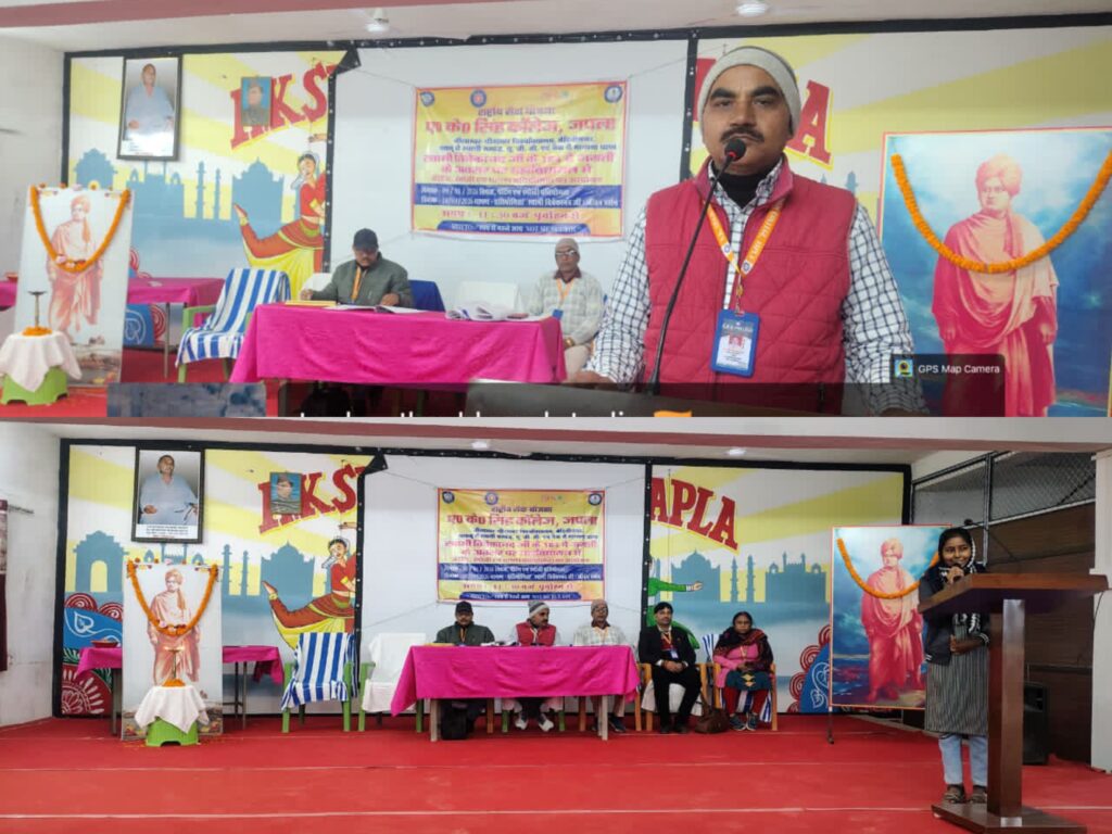 हुसैनाबाद : स्वामी विवेकानंद के 164वें जन्मदिवस के अवसर पर ए. के. सिंह कॉलेज, जपला में राष्ट्रीय सेवा योजना (एनएसएस) के तत्वावधान में पेंटिंग, रंगोली, क्विज एवं भाषण प्रतियोगिताओं का आयोजन किया गया। कार्यक्रम की अध्यक्षता महाविद्यालय के प्राचार्य डॉ. राम सुभग सिंह ने की। रंगोली प्रतियोगिता पाँच समूहों में आयोजित की गई। समूह ‘ए’ में पुष्पा कुमारी, रिंकी कुमारी एवं श्वेता कुमारी; समूह ‘बी’ में रिंकी कुमारी, रौनक कुमारी एवं निधि कुमारी; समूह ‘सी’ में नेहा शर्मा, प्राजक्ता कुमारी, रंजना कुमारी, शिखा सिंह एवं सोनू कुमारी; समूह ‘डी’ में ज्योति कुमारी एवं श्वेता कुमारी तथा समूह ‘ई’ में हीरालाल कुमार शर्मा ने भाग लिया। पेंटिंग प्रतियोगिता में नीतू कुमारी, श्वेता कुमारी, खुशबू कुमारी, सोनी कुमारी, शिल्पी कुमारी एवं अंजली कुमारी ने अपनी कला का प्रदर्शन किया। क्विज प्रतियोगिता में रिंकी कुमारी, शिखा सिंह, प्राजक्ता कुमारी, राखी मेहता, ज्योति कुमारी, रिमझिम कुमारी, प्रज्ञा कुमारी एवं लाल कुमार शर्मा शामिल हुए। वहीं भाषण प्रतियोगिता में श्वेता कुमारी, प्राजक्ता कुमारी, शिखा सिंह, प्रीति मेहता, राखी मेहता, नंदनी कुमारी, रागनी कुमारी, प्रज्ञा कुमारी, अंशु सिंह एवं रिंकी कुमारी ने स्वामी विवेकानंद के विचारों पर अपने विचार व्यक्त किए। इस अवसर पर आईक्यूएसी समन्वयक डॉ. आलोक रंजन कुमार, भूगोल विभागाध्यक्ष प्रो. मुकेश कुमार सिंह, प्रो. रेखा सिंह सहित सैकड़ों छात्र-छात्राएँ उपस्थित रहे। कार्यक्रम में लेखापाल ओम प्रकाश सिंह, विवेक कुमार, निखिल सिंह, प्रिंस सिंह एवं अन्य शिक्षकेत्तर कर्मचारी भी मौजूद थे। अपने अध्यक्षीय संबोधन में प्राचार्य डॉ. राम सुभग सिंह ने कहा कि स्वामी विवेकानंद महान धर्म सुधारक, समाज सुधारक, राष्ट्रप्रेमी एवं विश्व मानवतावादी थे। उन्होंने सभी धर्मों की समानता पर बल देते हुए मानवता को सर्वोपरि माना। विवेकानंद जी का दर्शन अद्वैत वेदांत पर आधारित था तथा उनका सामाजिक दर्शन वेदांती समाजवाद था। कार्यक्रम पदाधिकारी प्रो. राजेश कुमार सिंह ने कहा कि राष्ट्रीय सेवा योजना के माध्यम से छात्र-छात्राओं के सर्वांगीण विकास के लिए निरंतर विभिन्न गतिविधियाँ आयोजित की जाती हैं, जिससे विद्यार्थियों की छिपी प्रतिभाएँ सामने आती हैं। कार्यक्रम का धन्यवाद ज्ञापन प्राणी विज्ञान विभागाध्यक्ष सह खेलकूद प्रभारी डॉ. राहुल कुमार सिंह ने किया।